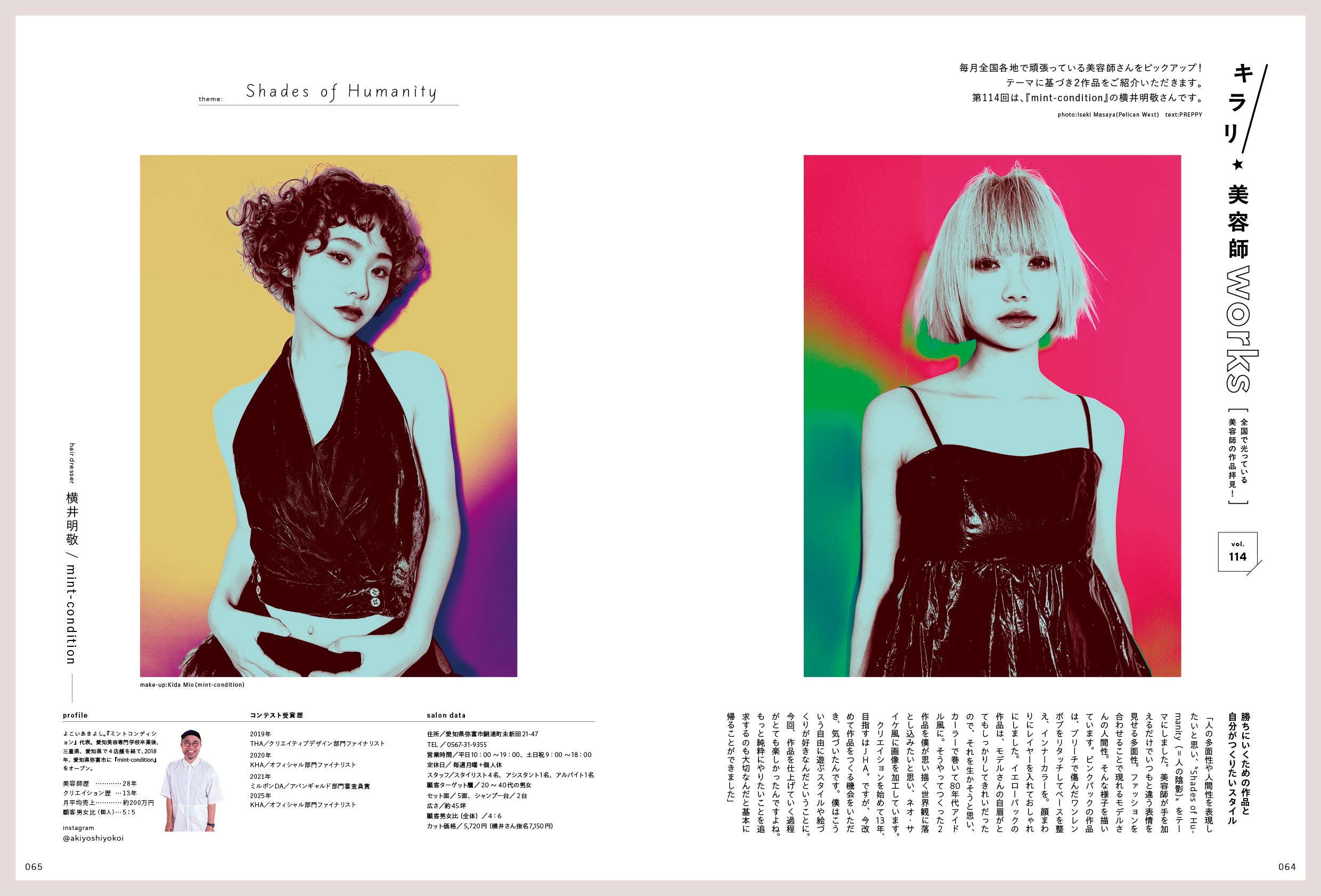 毎月全国各地で頑張っている美容師さんをピックアップ。テーマに基づき2作品をご紹介いただく連載の第114回は『mint-condition』の横井明敬さんです。「Shades of Humanity(=人の陰影)」をテーマにした作品をぜひCHECKしてください。