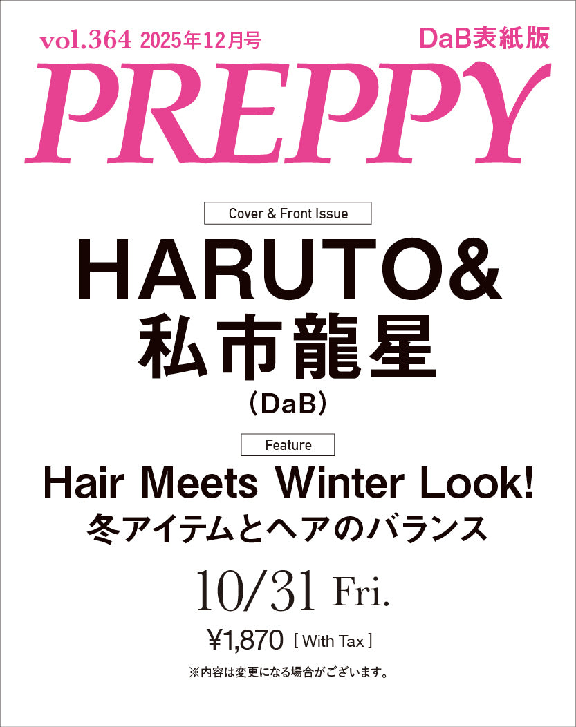 PREPPY 12月号の特大ヘアカタは「Hair Meets Winter Look」。コートやマフラーなど冬のアイテムとヘアのバランスを、ファッション感度の高い美容師たちが提案します。表紙&巻頭特集を飾るのは、老舗サロンでありながら常に美容業界の最先端にいる『ダブ』からHARUTOさんと私市龍星さんが登場。美容業界でも注目を集めるふたりが描く世界観に注目!